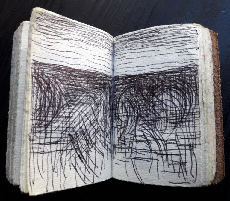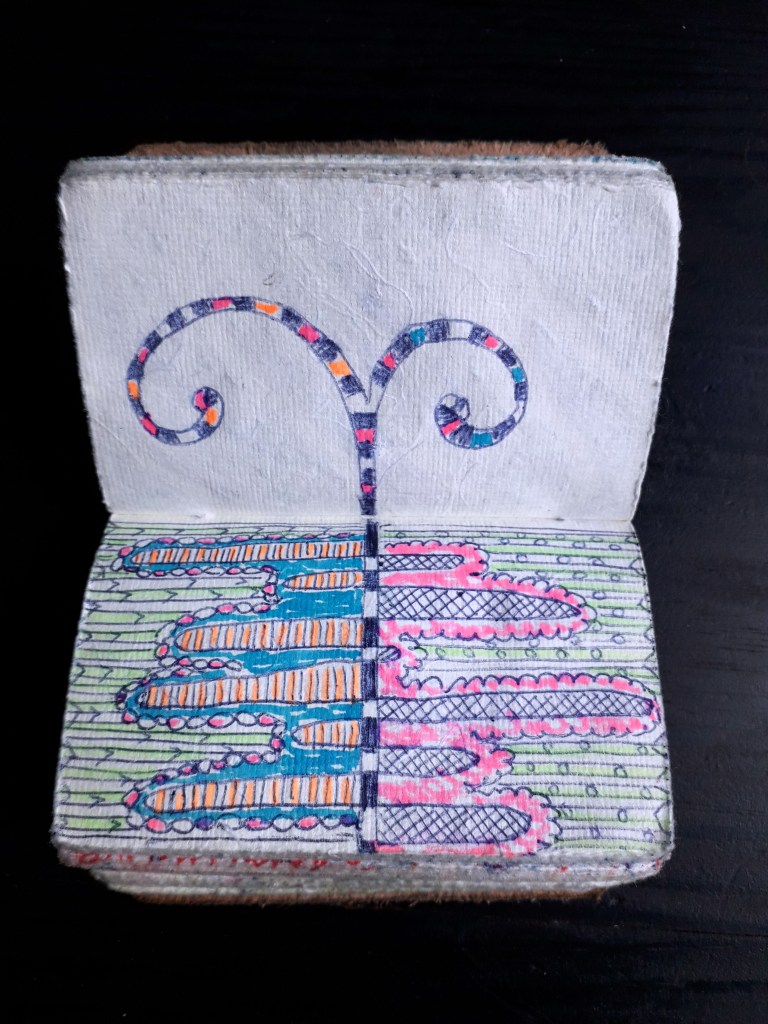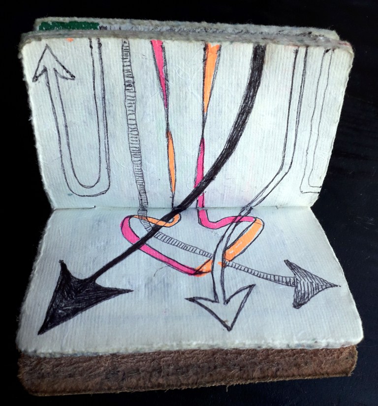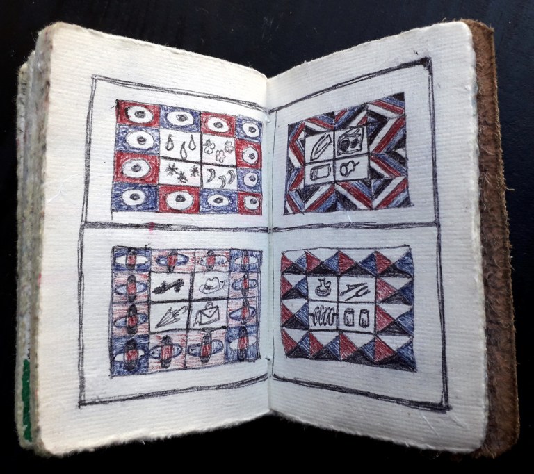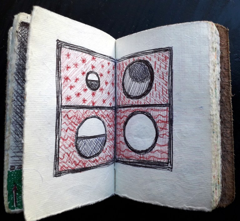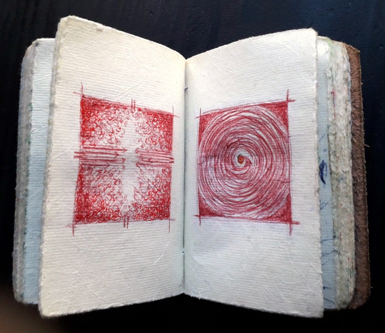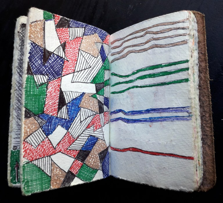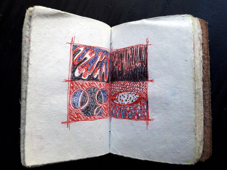 Un petit carnet de poche dessiné, de format 9 x 9 x3 cm, pour dessiner ce qui vient au jour le jour, les hauts, les bas, les autres, avec ce qui tombe sous la main : feutres, stylo bille…