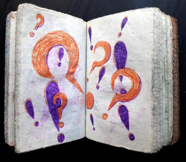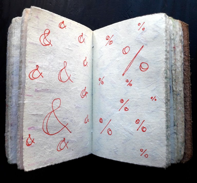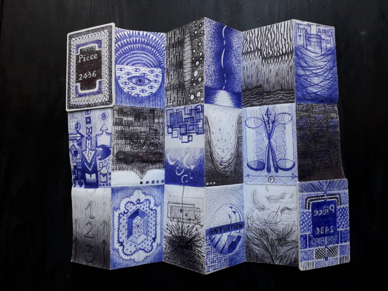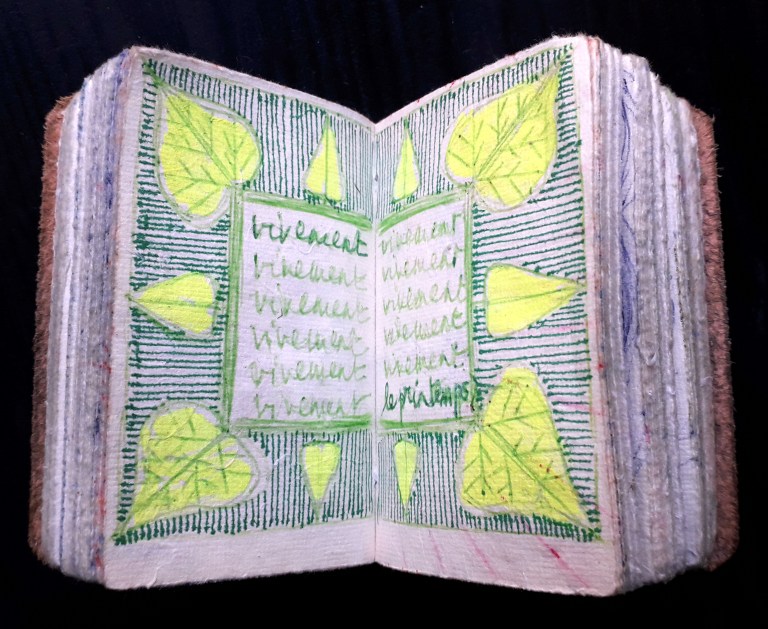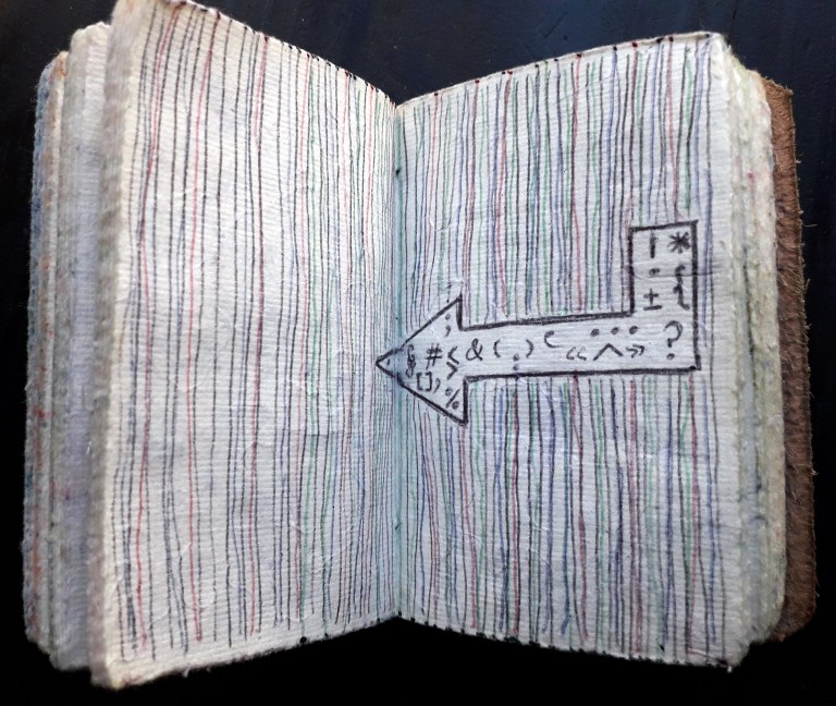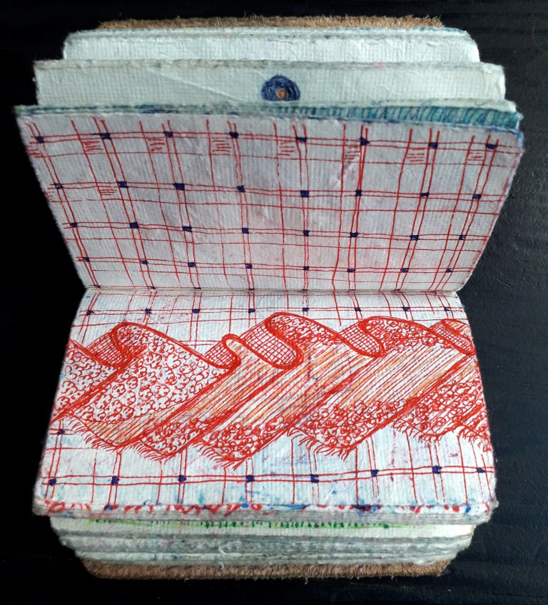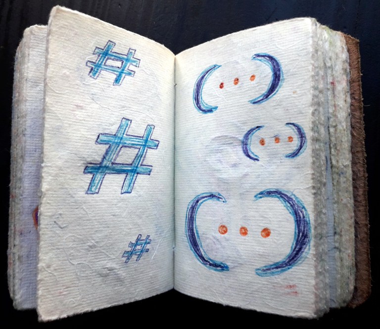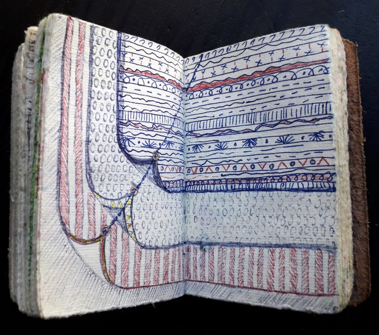 Un petit carnet de poche dessiné, de format 9 x 9 x3 cm, pour dessiner ce qui vient au jour le jour, les hauts, les bas, les autres, avec ce qui tombe sous la main : feutres, stylo bille…