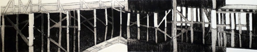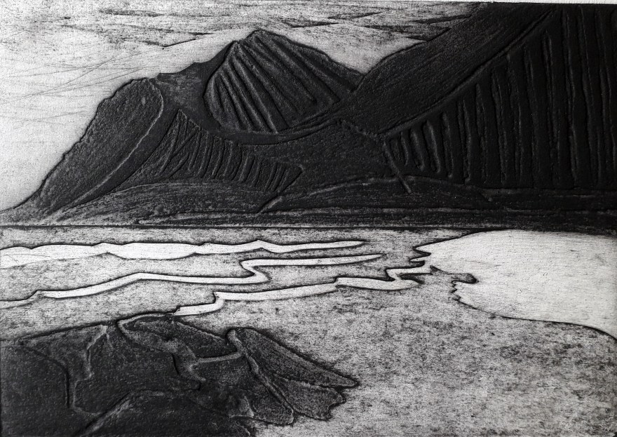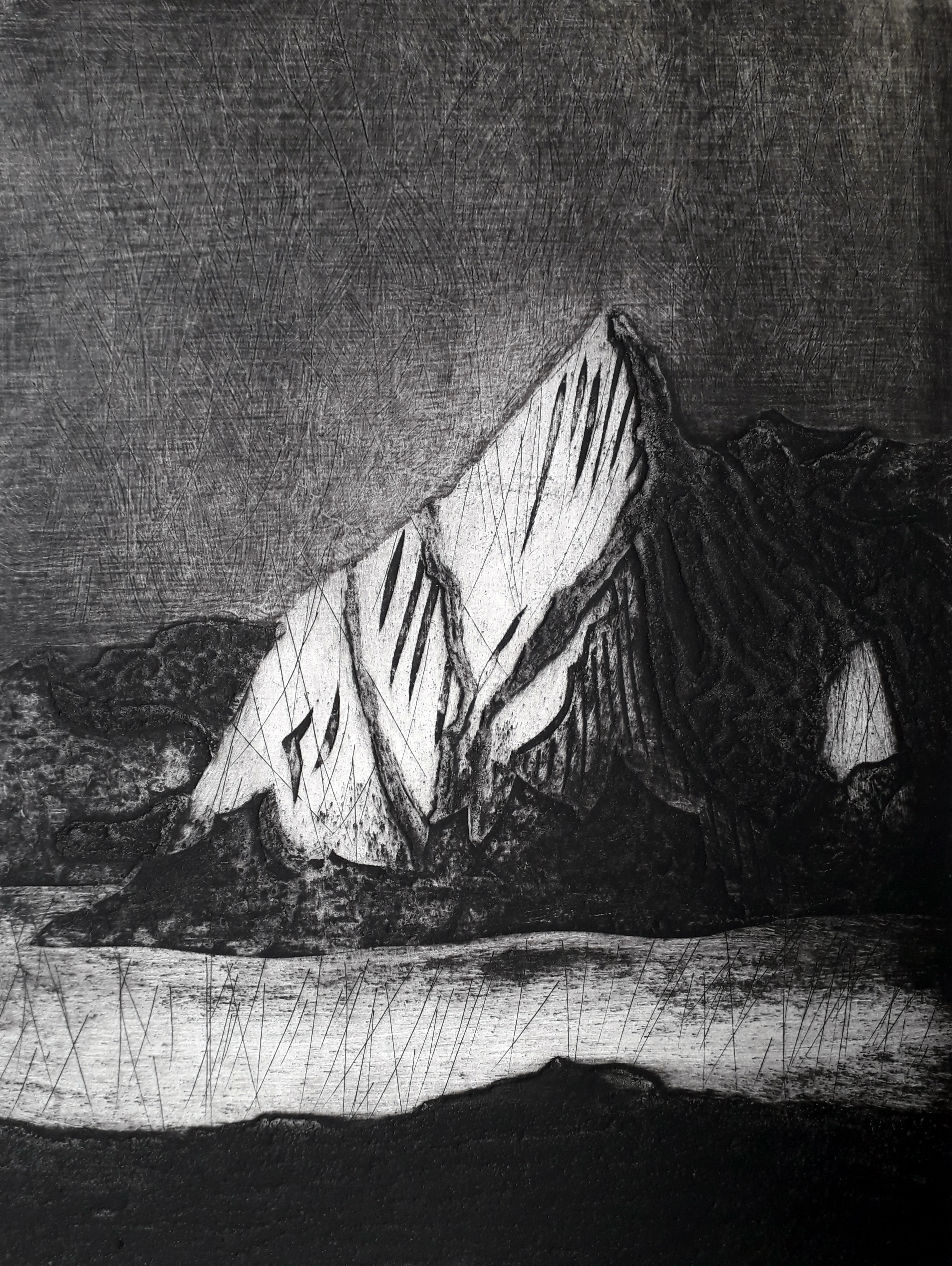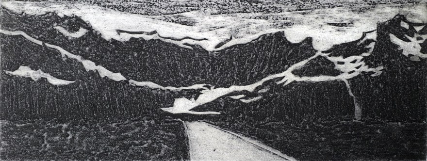 Paysages sublimes vus en noir et blanc dans la froidure. Les matières du carton enduit, gravé au cutter, et du sable leur conviennent.