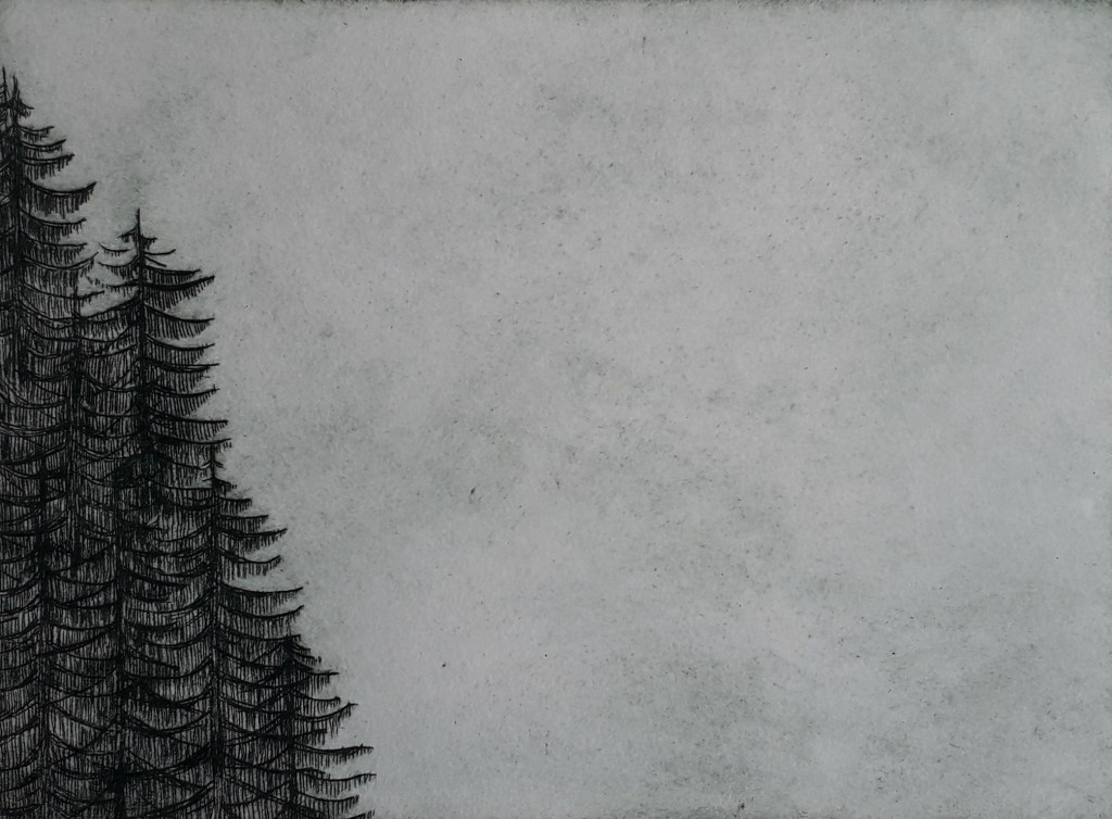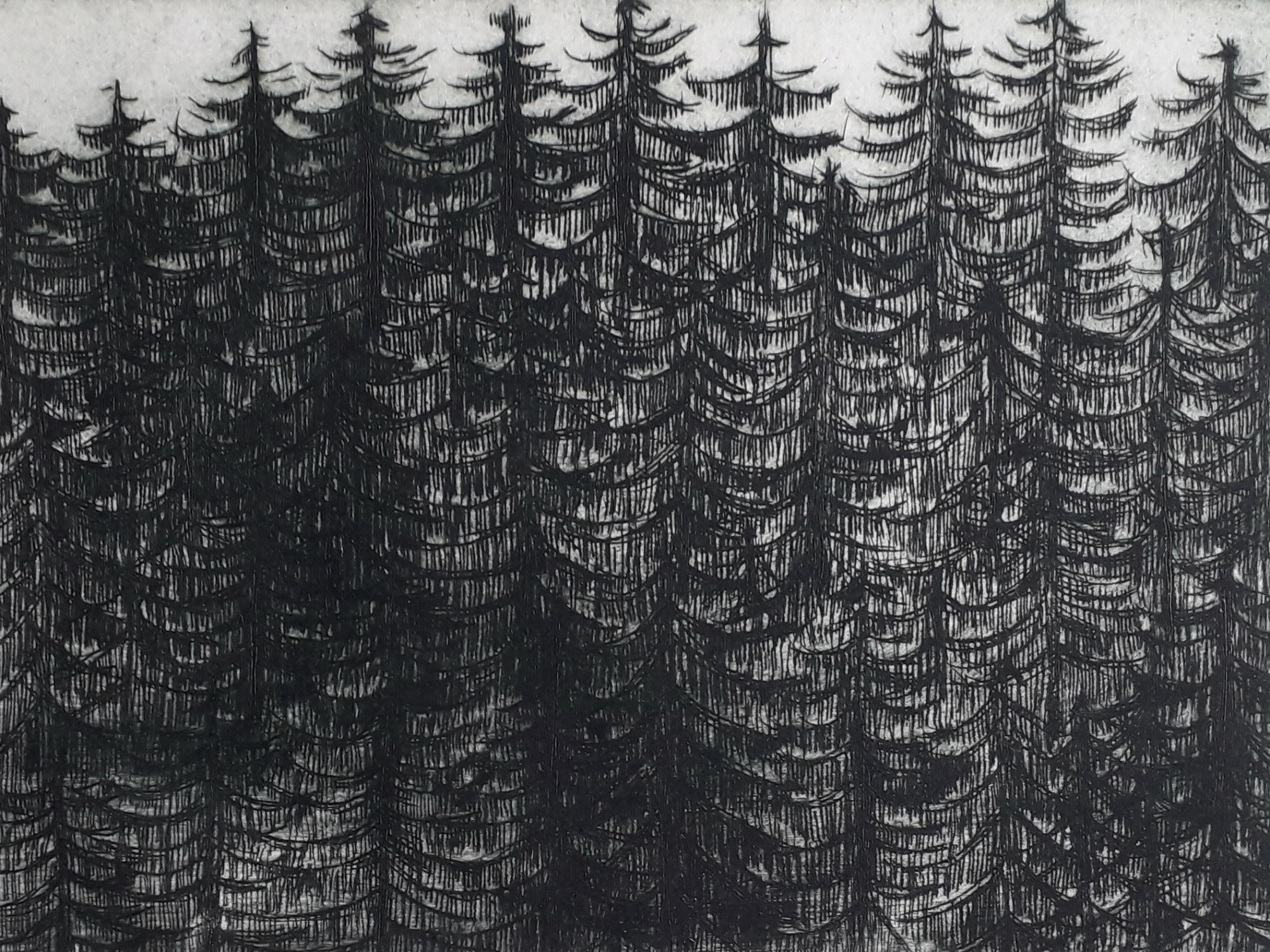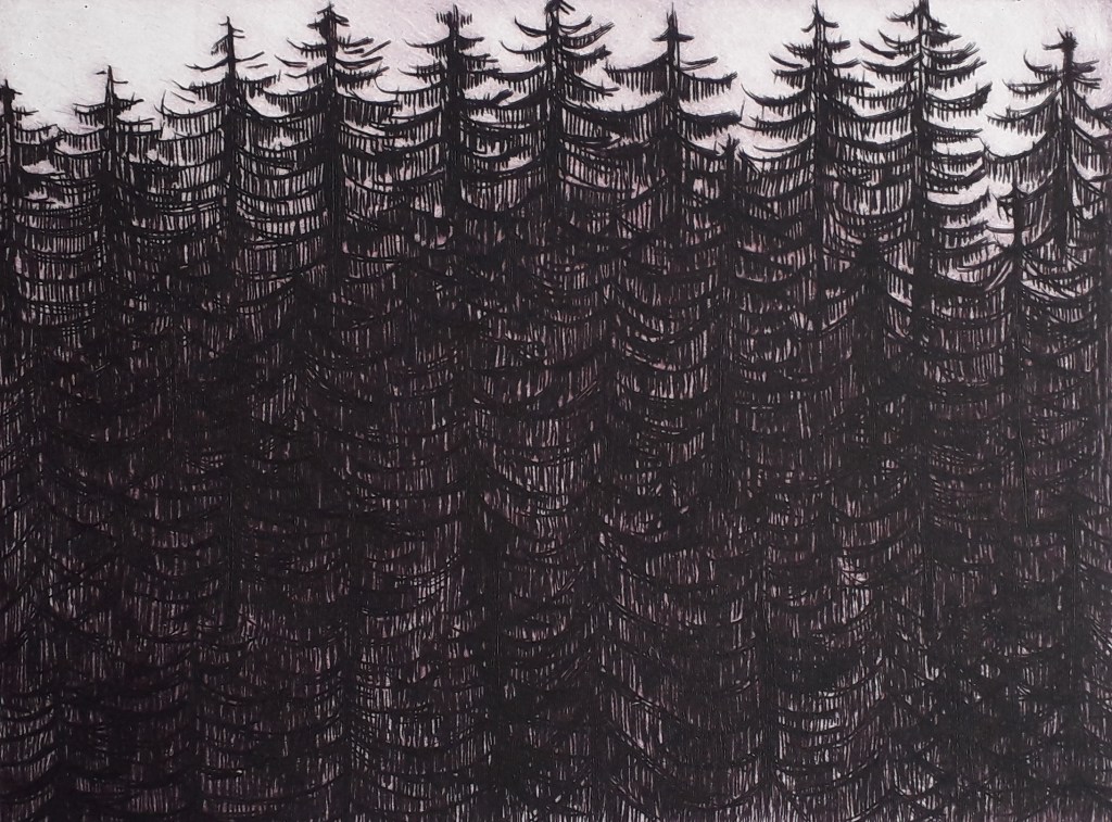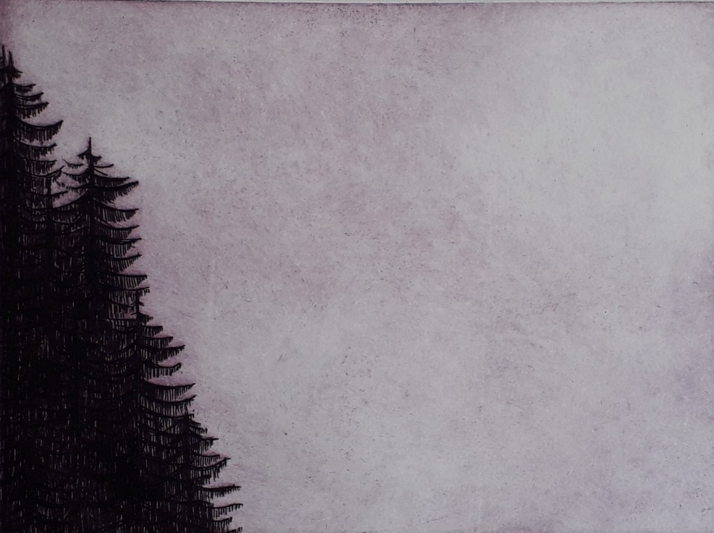 La forêt de pins des Vosges en couvre les flancs en rangs serrés. Elle change de couleur avec les heures. Pointe sèche sur plaque de plastique très dur. Format 15.5 X 23.5 cm.